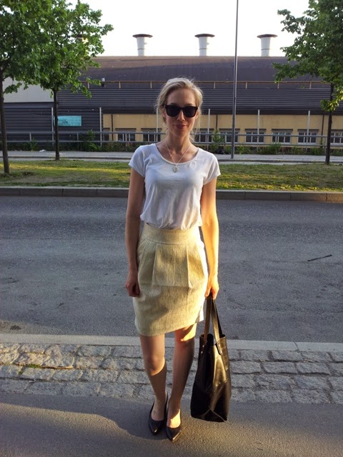 Nu er det ikke pga det kongelige bryllup her i Stockholm i dag at jeg er trukket i det gyldne skørt (men jeg kunne sagtens have fundet på det). Billederne er nemlig fra i går aftes, hvor jeg var ude at spise med kæresten ved Hornsberg Strand her i Stockholm. Vi har haft så fint sommervejr de sidste par dage, så jeg så det som en perfekt anledning til at gøre mig lidt fin. Der skal jo ikke så meget til med sådan en nederdel i guld. Jeg synes den er så fin og selv om den ikke kommer på så ofte, så er jeg alligevel ret glad for at jeg købte den for nogle år siden.